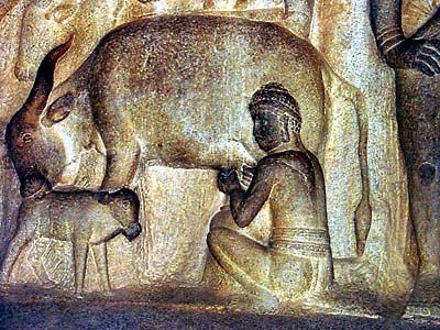 Ans: The cow was revered in Hinduism for its peaceful and nurturing qualities. It symbolized purity, wealth, and fertility and was often associated with the goddess Kamadhenu.